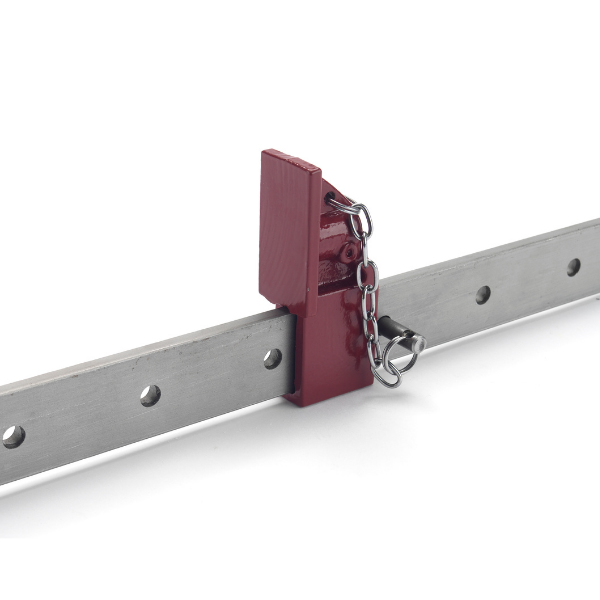 Slide secured by a solid steel pin passing through one of the location holes spaced along the steel bar.