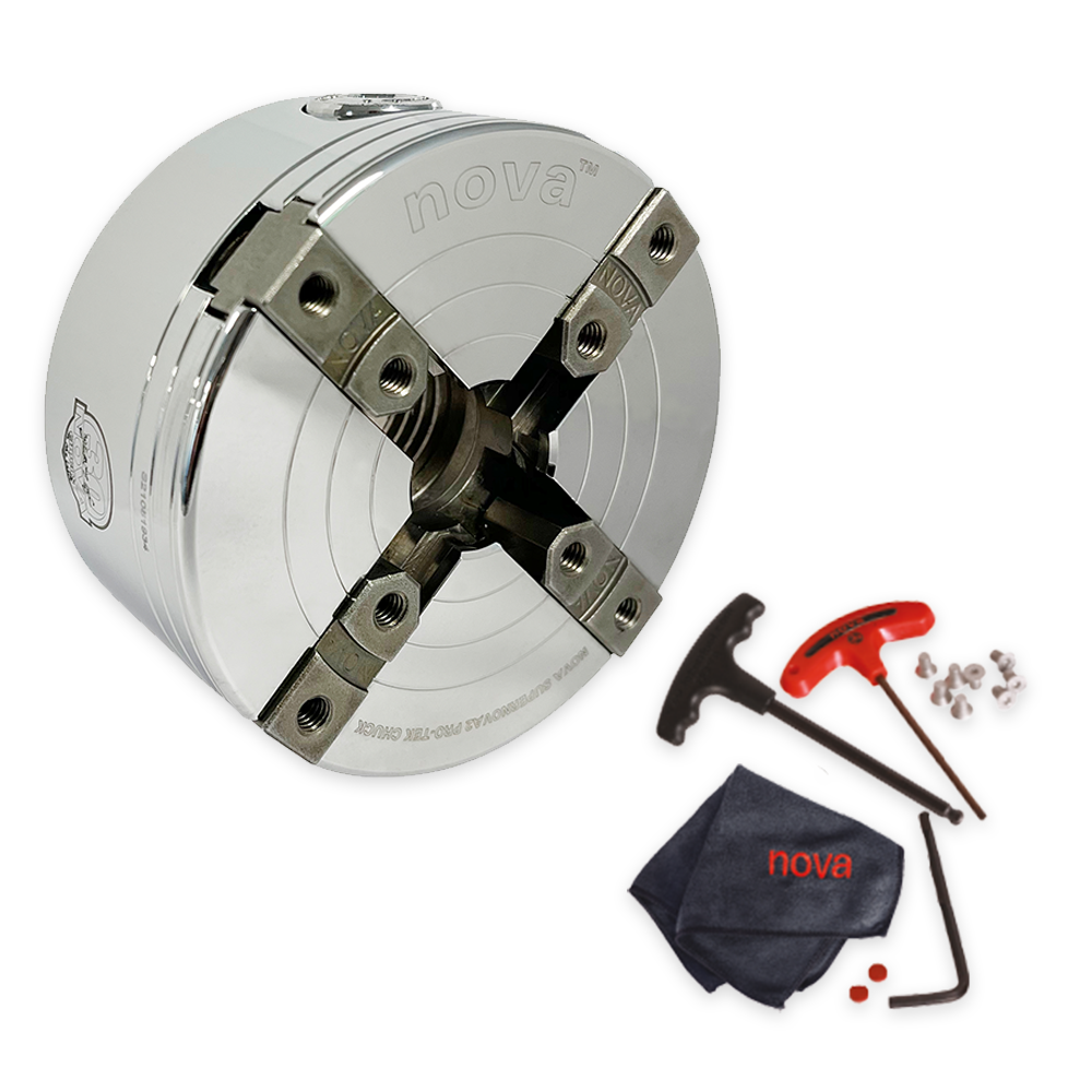 - Free NOVA microfiber workshop towel (11.5"/29.5mm x 10.5"/27.5mm) to help keep your chuck and jaws well maintained.